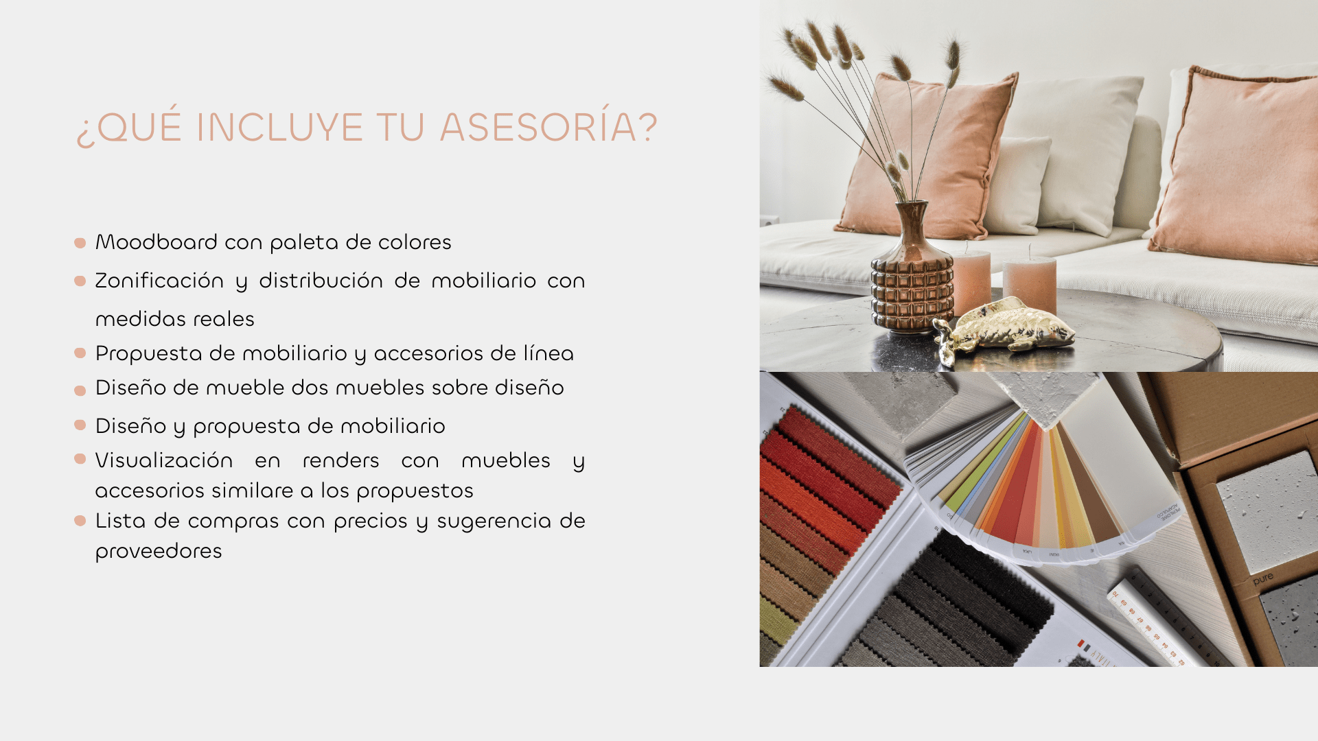Nuestro servicio resulta perfecto si estás buscando darle un giro positivo a tu hogar, oficina o negocio. Nos enfocamos en ofrecerte un plan de acción que puedas ejecutar tu mismo, proporcionándote una guía de estilo y una propuesta de diseño, así como una lista de compras. Además brindamos la ventaja que puedes disfrutar de esta asesoría de forma remota.